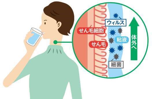 風邪をひきやすい理由のひとつである『’せん毛’の乾燥』は水分を補給することで予防できます。くわえて、水分補給は血流の改善にも有効です。