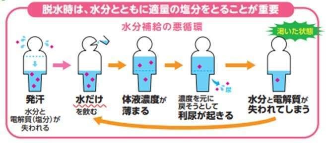 水分の補給時に『塩分』を含まない水分を補給していくと、大変です。