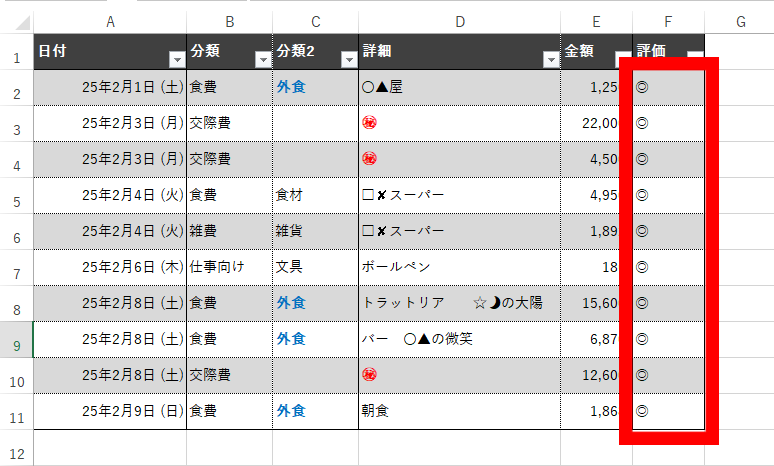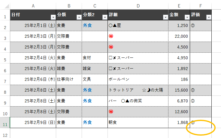 最後のセル(右側最下段:F-11)の線が変わってる。